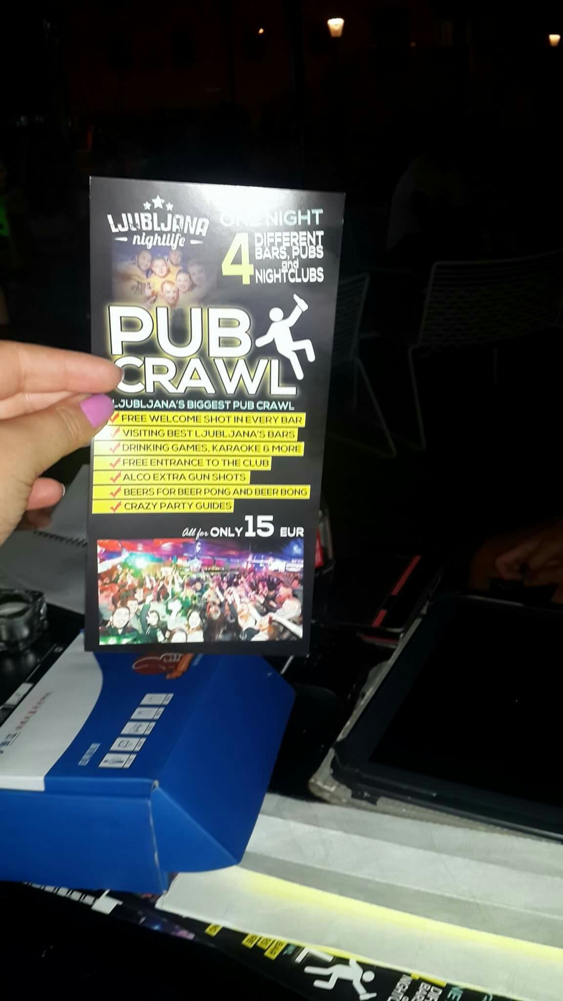 Quando siamo arrivati al primo bar i bicchierini erano pronti e abbiamo iniziato a giocare a beer pong e a flip cup, poi siamo andati al secondo bar dove abbiamo assistito a grandi karaoke in cui tutti cantavano, persino una simpatica barista si è unita a noi e ha cantato con noi, abbiamo preso due bicchierini in questo posto e siamo andati in un altro. Era un locale di preparazione, abbiamo preso gli shot e poi abbiamo ballato e fatto delle sfide divertenti! Ho anche vinto una delle sfide e ho ricevuto un cocktail extra. Dopo siamo andati in discoteca dove abbiamo preso anche noi uno shot e dove abbiamo passato una notte fantastica fino a tardi. Una notte da ricordare e anche una sbornia:) raccomando il team di vita notturna di Lubiana a tutti:)